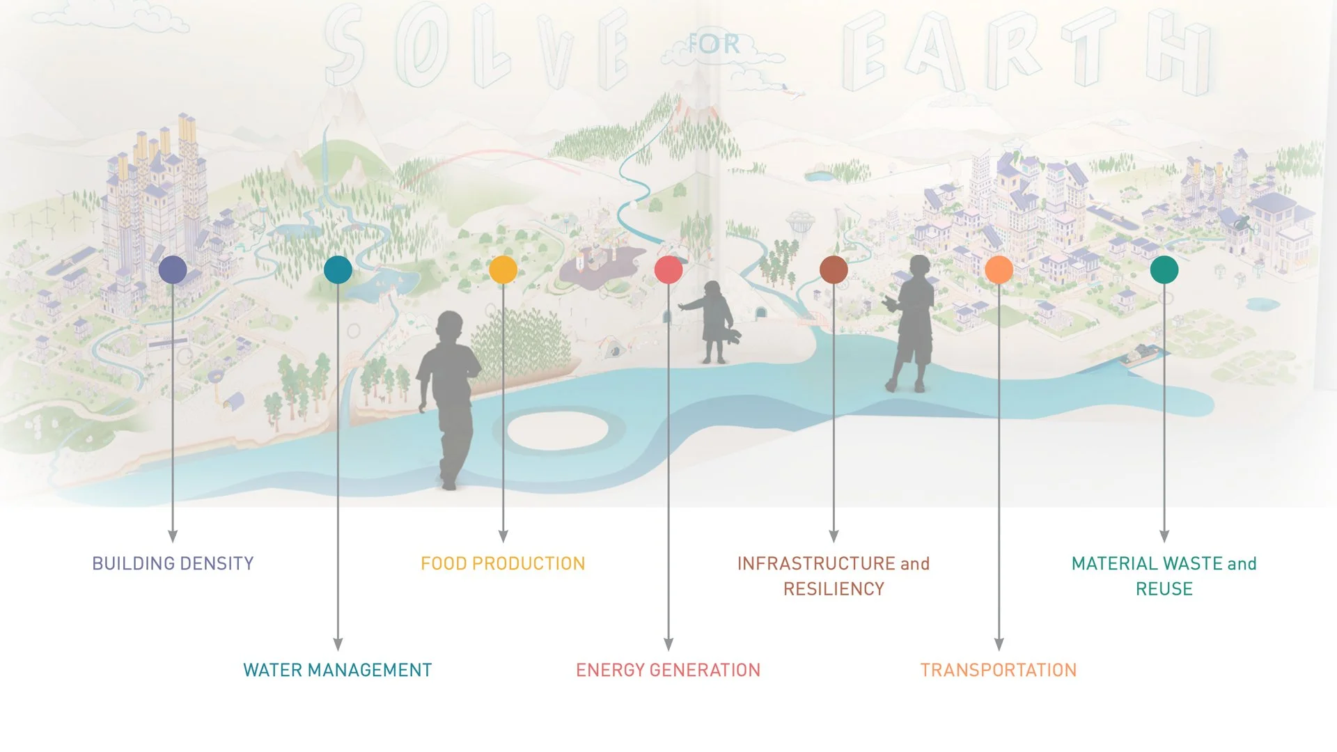Connections Wall is an interactive installation created as an introductory experience for The Tech Interactive's new sustainability exhibit, Solve For Earth. The long interactive wall consists of seven zones, each focusing on a different parameter that visitors will encounter in the greater exhibit: Building Density, Water Management, Food Production, Energy Generation, Infrastructure and Resiliency, Transportation and Material Waste and Reuse.