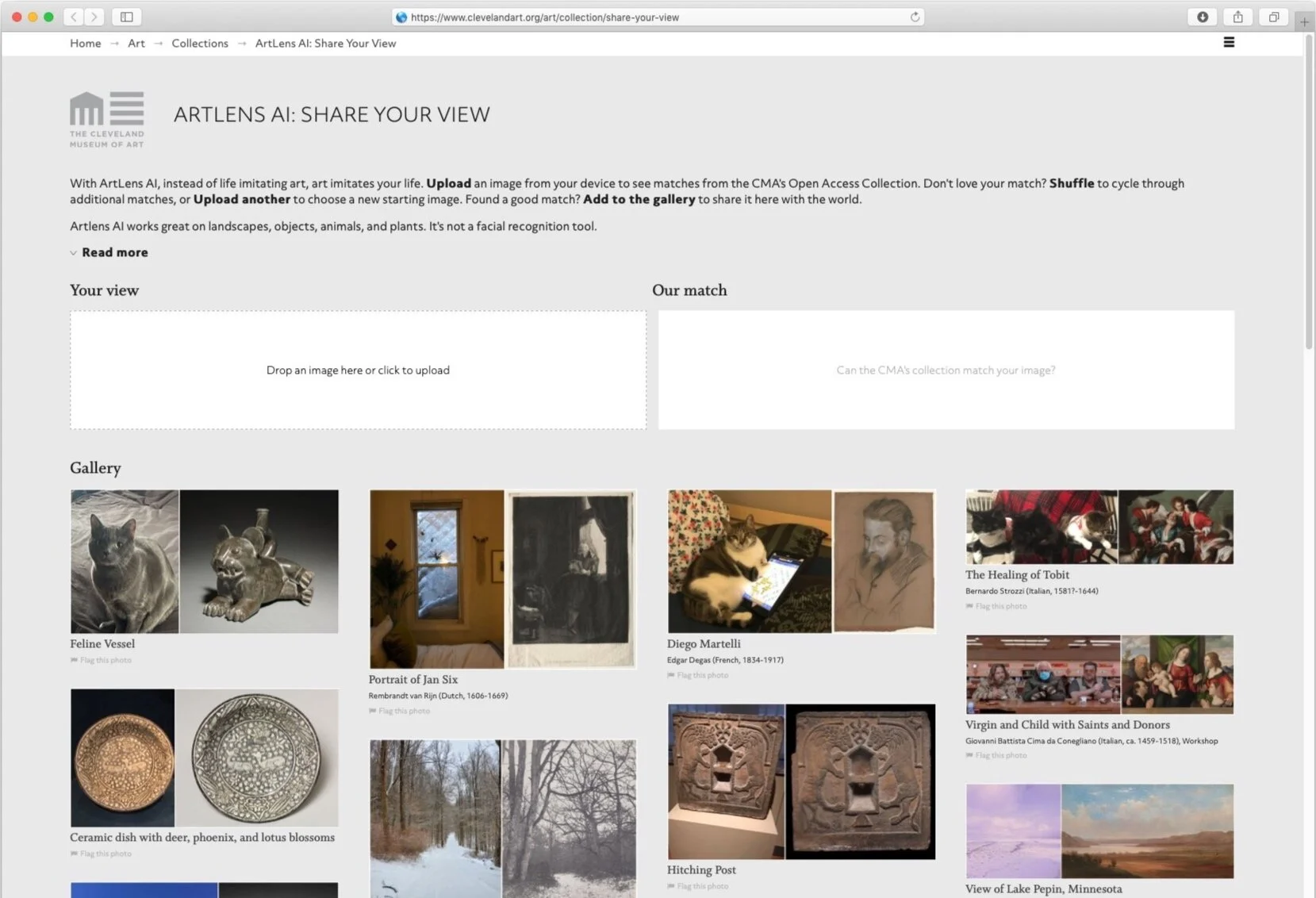 Keeping outcomes open and varied, users can shuffle through other close lookalikes after making a match with Share Your View, download a composite image to share with friends, or add the image to the CMA visitor gallery. Links to the CMA’s Collection Online offer you more than 36 fields of metadata about each work of art, such as an artist biography, citations, and curator videos. On Twitter, users can attach a photo or an image to a tweet and mention @ArtLensAI to share their view. The Twitter bot will automatically reply with a matching artwork.